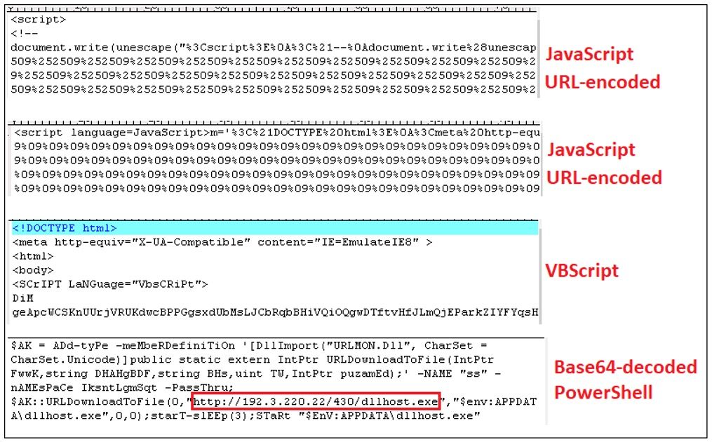 Its code is wrapped in multiple layers using different script languages and encoding methods, including JavaScript, VBScript, Base64-encoded, URL-encoded, and PowerShell, to protect itself from detection and analysis.