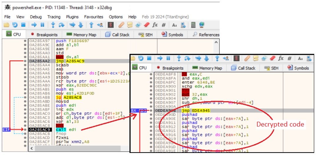 As I mentioned, the copied malicious code relies on a 32-bit version of PowerShell. It first runs a piece of self-decryption code mixed with a huge amount of useless instructions, creating a big challenge for analysts. Figure 10 presents the end of the decrypting code, where it is about to execute the "call edi" instruction. The EDI register now points to the decrypted code, as shown on the right.