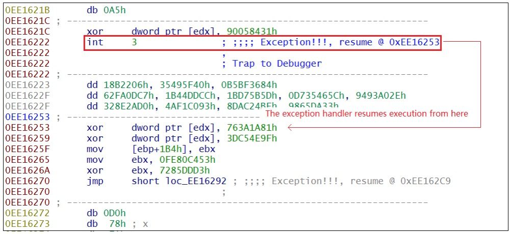 Whenever an exception occurs, the exception handler is called to handle it. The exception code provides corresponding ways to restore the code to resume from another offset. There are numerous exception instructions inside the malicious code. In other words, this strategy drives the entire code.