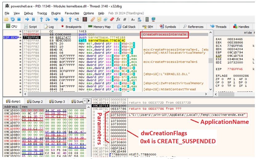 The malicious code performs process hollowing to put itself into a newly created Vaccinerende.exe process (copied from dllhost.exe). To do this, it calls the API CreateProcessInternalW() with CreatFlags of CREATE_SUSPENDED (0x4), which will suspend the new process after it is created. It then calls some related APIs to transfer all the malicious code to the new process and run it.