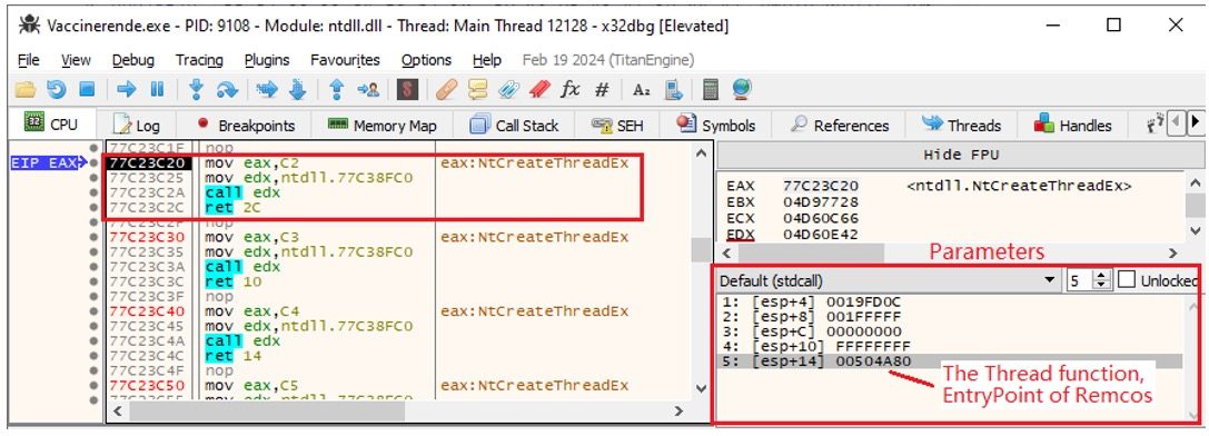 It then starts Remcos on a thread, where the thread function (StartAddress) is the entry point. To start the thread, it calls an undocumented API, NtCreateThreadEx(). Figure 15 shows a screenshot of the debugger as it is about to call the API to start Remcos.