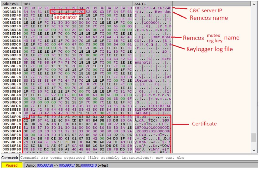 - Remcos is assigned the name "Rmc-DSGECX," which is defined in the setting block.