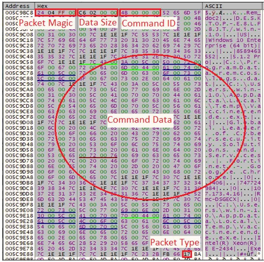 Remcos collects some basic information from the victim's device. It then encrypts and sends the collected data to its C&C server to register that the victim's device is online and ready to be controlled. This is the first command packet sent to the C&C server.