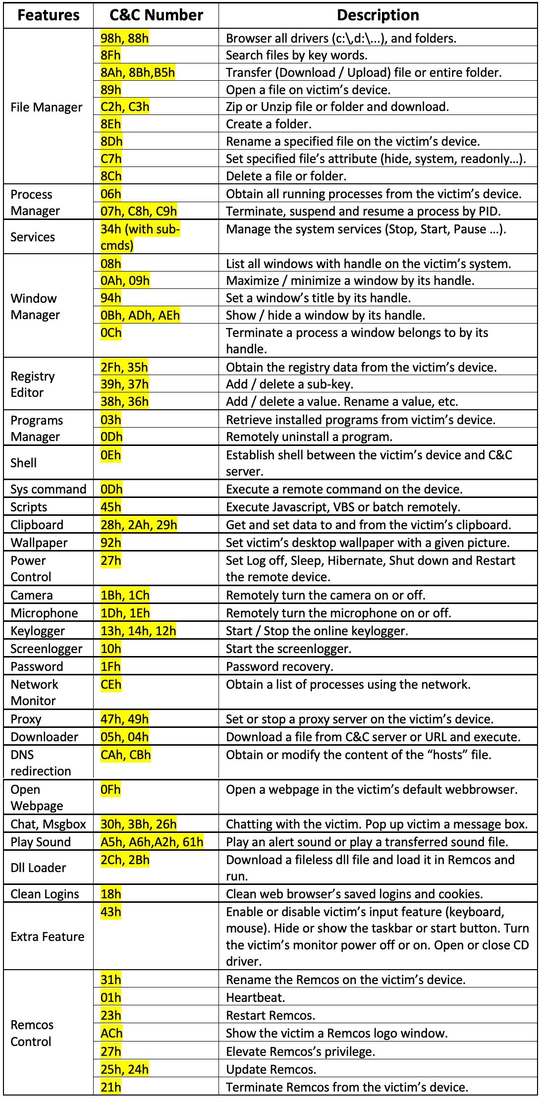 My analysis of this function shows that Remcos has the features and commands listed in the following chart.