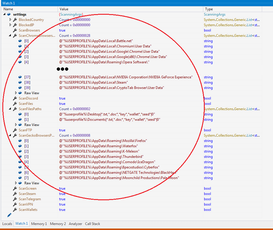 Redline can steal victims' personal information, including saved credentials, auto-fills, credit card information, tokens, private keys, cookies, profiles, logs, and more, from the default software clients listed above. It also obtains all files from the victim's Desktop and Document folders as long as their filename contains "txt", "doc", "key", "wallet", or "seed".