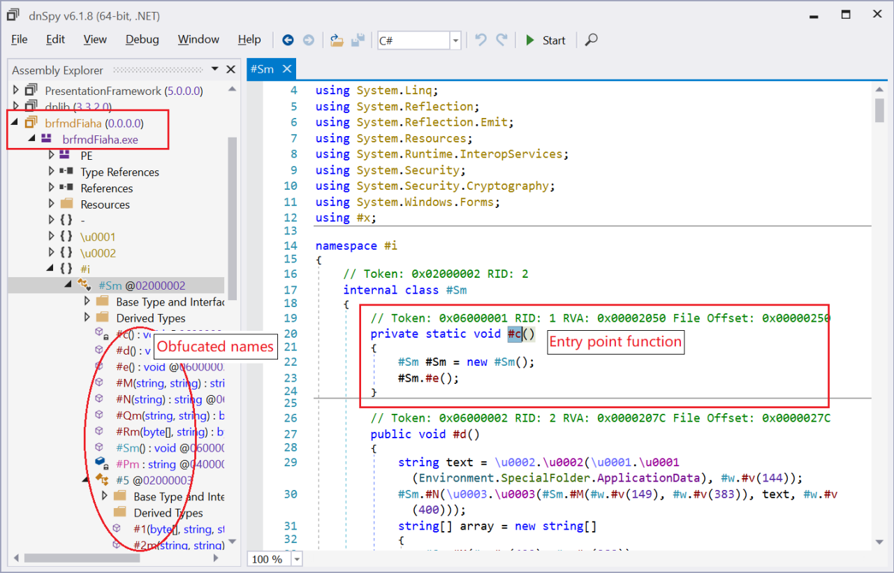 Figure 1.1 shows the sample in a debugger with obfuscated names and entry point function (main() function) shown using SmartAssembly.
