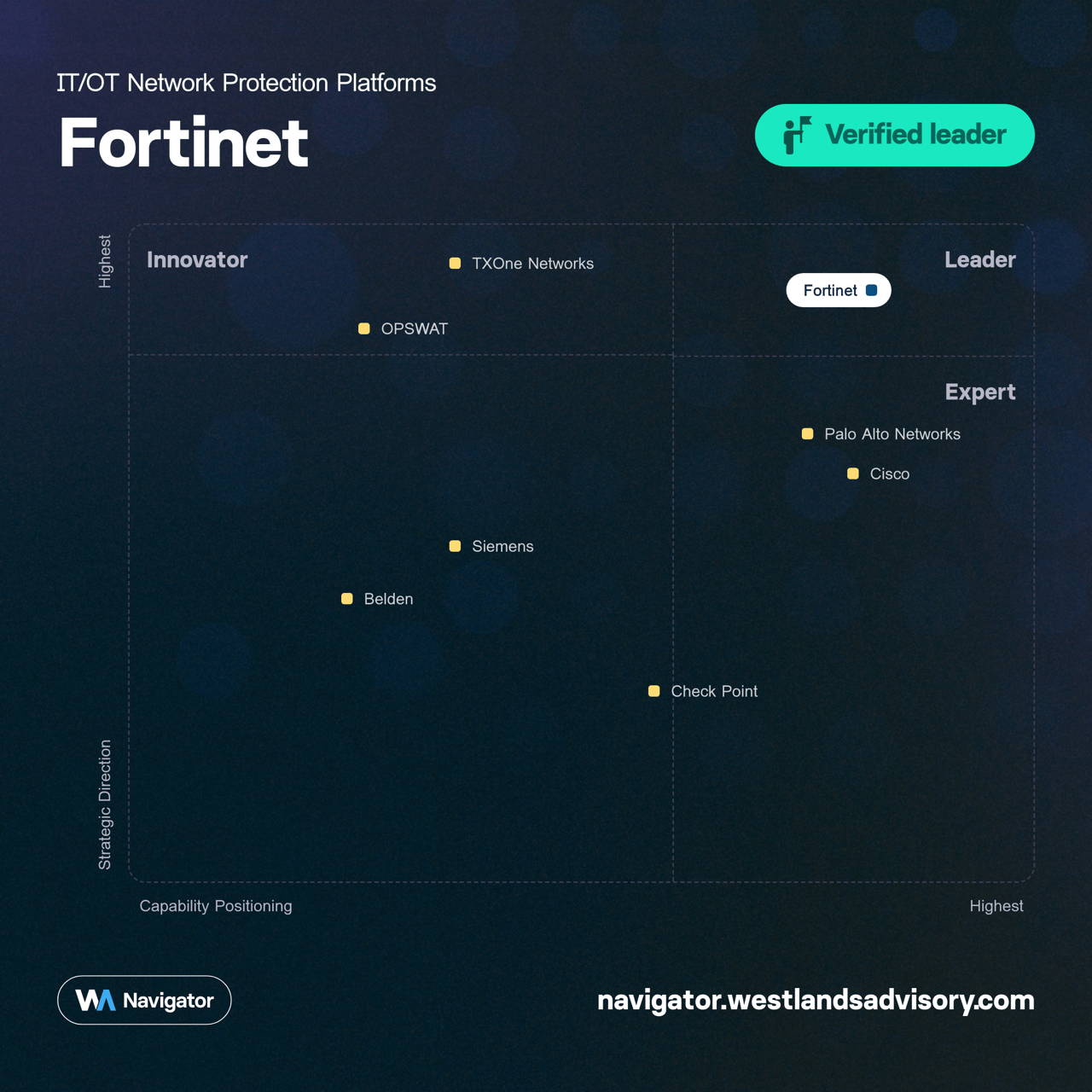 Fortinet is pleased to announce that we have been recognized as the sole "Leader" in the 2023 IT/OT Network Protection Platforms Navigator™ from Westlands Advisory, which highlights the comprehensive network and cybersecurity solutions in the Fortinet OT-Aware Security Fabric.
