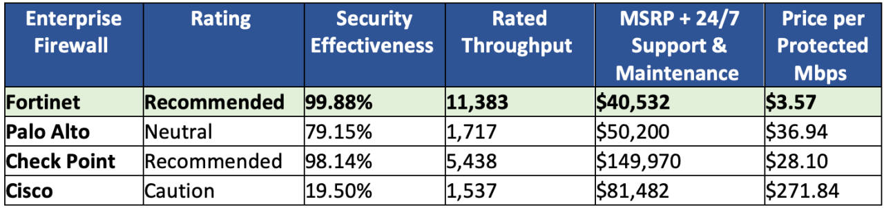 CyberRatings.org calculates each firewall vendor's "Price per Protected Mbps," which takes the vendor's security effectiveness score and multiplies it by their rated throughput. MSRP plus 24x7 support and maintenance is then divided by the combined security effectiveness and throughput number. The result is an accurate and equally applied assessment of the specific price per protected Mbps. Fortinet was extremely competitive in this assessment, delivering the industry's highest ROI among all major firewall players.
