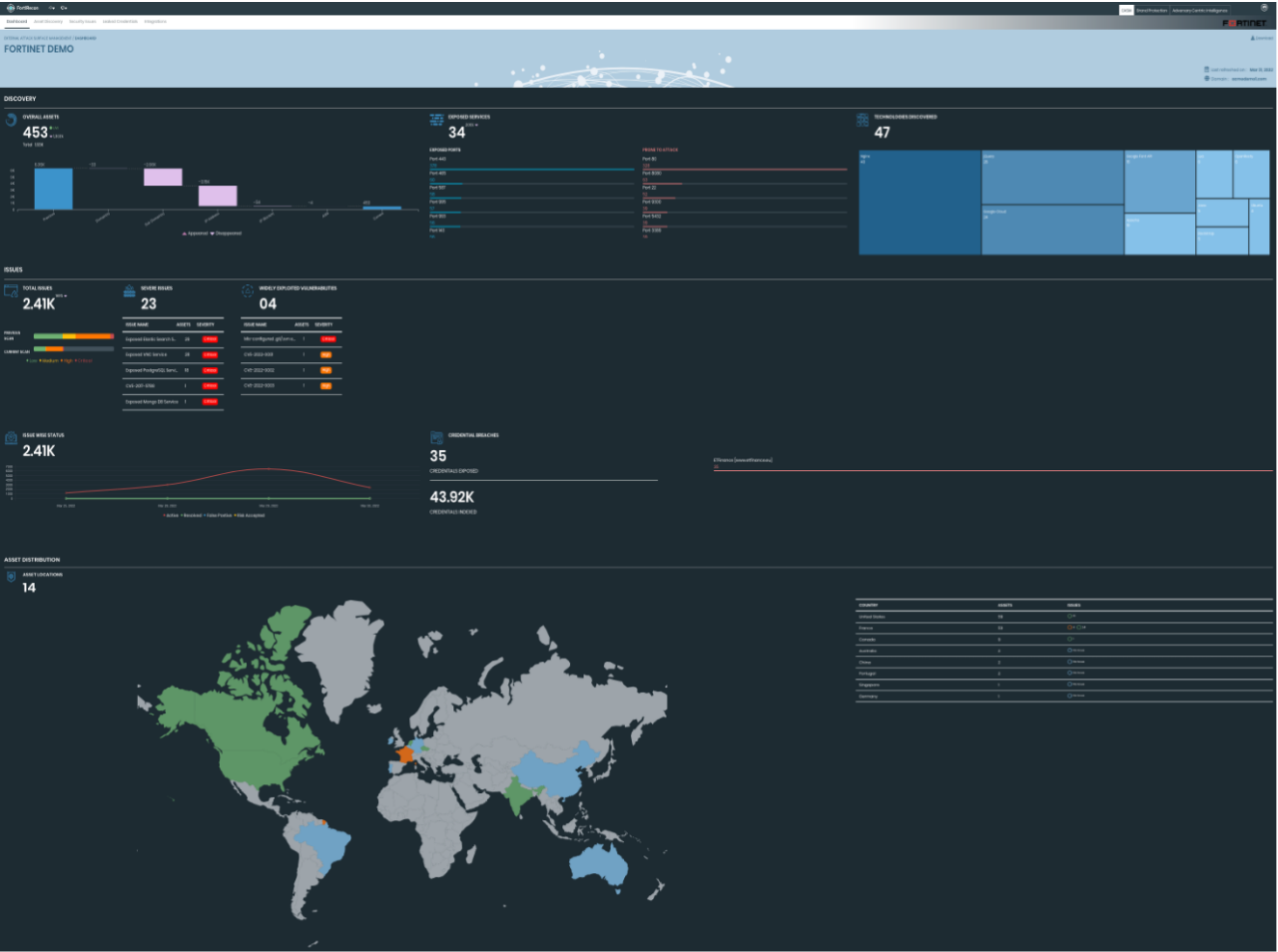 The FortiRecon External Attack Surface Management (EASM) solution provides an attacker's view into your environment, showing you what they can easily discover during the reconnaissance phase of their attack. External scanning finds known/unknown attacker-exposed assets (e.g., domains, sub-domains, ASN, IP blocks, IP addresses). FortiRecon EASM then identifies exploitable vulnerabilities, such as configuration errors, SSL certificate issues, prone-to-attack ports, exposed database services, DNS-related issues, leaked data/credentials, and more. The service provides you with a detailed description of any security issue it identifies, as well as actionable remediation information. Global organizations can also view a global map of exposed digital assets per country, prioritizing assets or vulnerabilities by security severity.