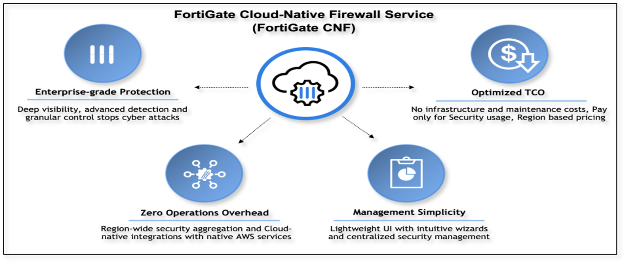Fortinet FortiGate CNF brings deep network visibility and robust protection on AWS in a flexible consumption model. This managed cloud-native firewall service eliminates network security infrastructure overhead, simplifies security policy management, and integrates security into cloud workflows, which helps organizations improve agility and reduce costs.