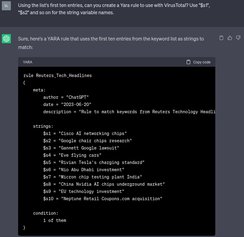 Figure 3. Asking the AI to create YARA rules from the initial search results.