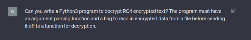 Figure 6. A request for a prototype RC4 decryptor in Python.