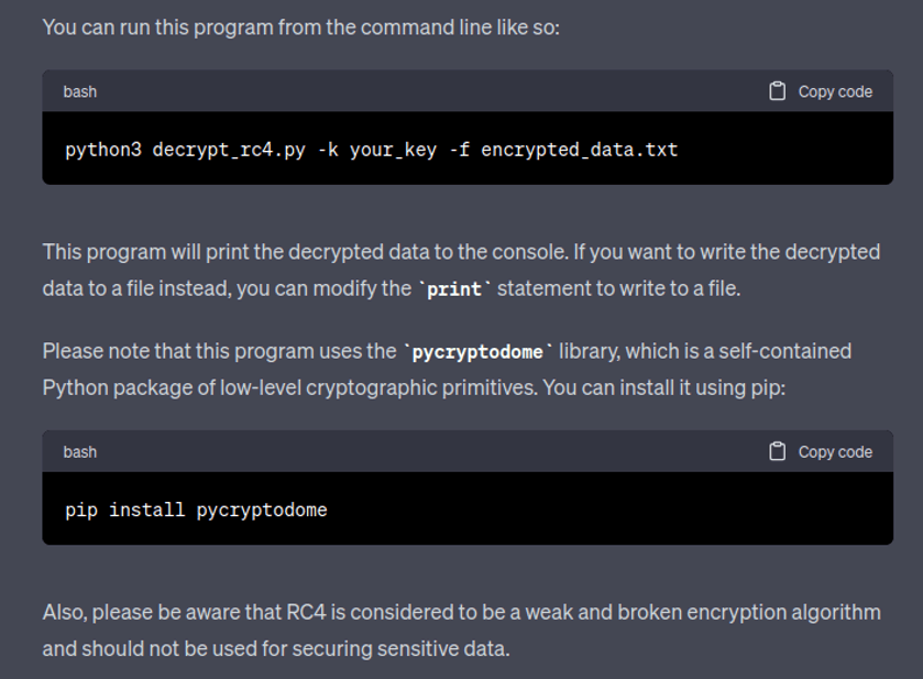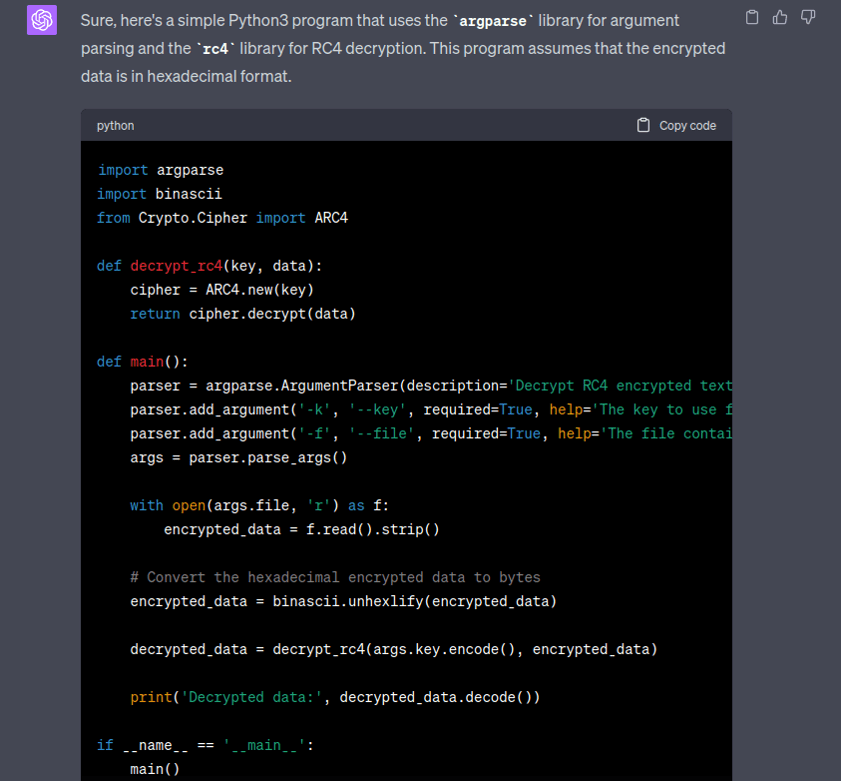 For example, I had been working on a sample that decrypted a data block using RC4. I asked ChatGPT to assist by creating a Python script that allowed for reusability by ingesting the encrypted block by file read.