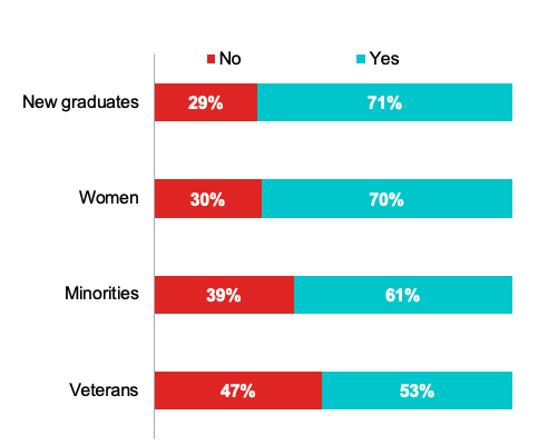 Despite the challenges, or perhaps because of it, three out of four organizations implemented formal processes to hire more women, and nine out of 10 actively engaged women and new graduates during the last three years. Fifty-nine percent of companies have structures in place to hire minorities, and 51% for hiring more veterans.