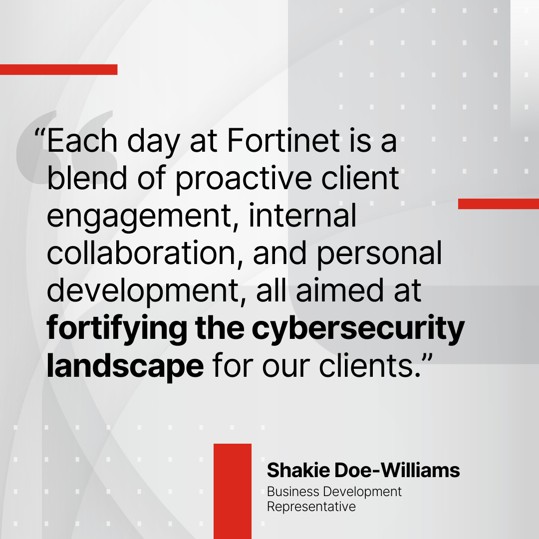 We recently interviewed Fortinet business development representative (BDR) Shakie Doe-Williams. We learned why Shakie believes Fortinet is a great place to work, discussed his role within the organization, and got his unique perspective on the cybersecurity industry and the Fortinet culture, which is built upon three core values: teamwork, innovation, and openness.