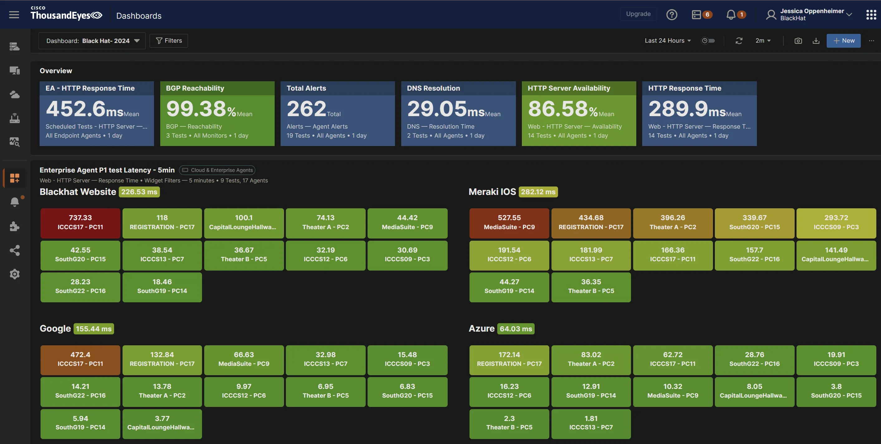 We had a dashboard in the NOC, so the leaders and architect could see issues in real time, and ThousandEyes widgets in the Splunk executive dashboard, as seen earlier in the blog.