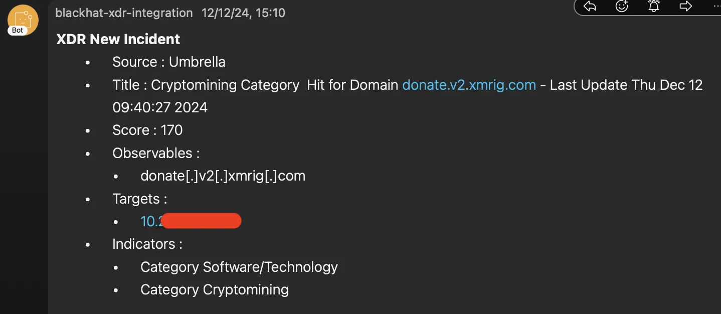 Remember from our past blogs, we used automation for incident notifications into Webex, as well as '' in XDR for Umbrella category blocks. Both these workflows were spruced up and used extensively at Black Hat Europe 2024. We now see the last update timestamp right in the incident title itself and the Webex message, which greatly simplifies the understanding of a detection for our threat hunters.Creating an Incident
