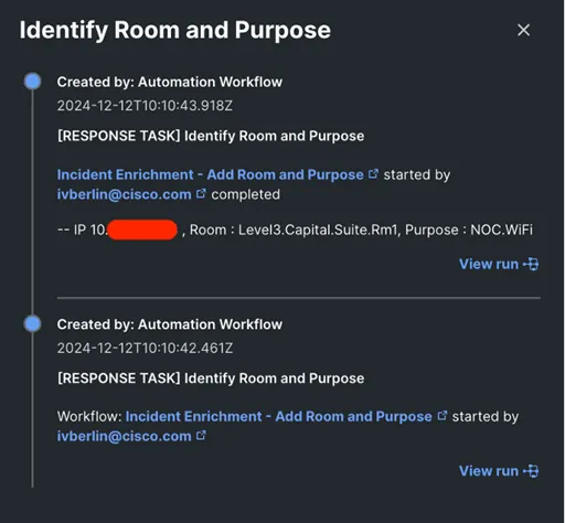 Next question -who is this 10.X.X.X device? And should they be cryptomining at Black Hat? Thanks to another automation workflow, with a click of a action of the Incident Response playbook we had attribution with physical room name and location within the event center from a pre-defined database for the identified asset in the incident. Response