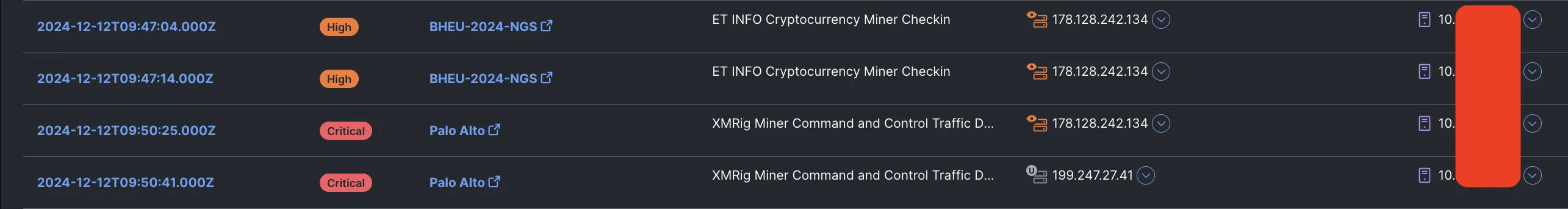 An example of some of these workflows in action together helped us hunt down a potential case of cryptomining in the NOC itself, during the early hours of Dec 12! Thanks to the Corelight and PANW firewalls integrations in XDR, we had ourselves a singular correlated incident, with detections from both partners.