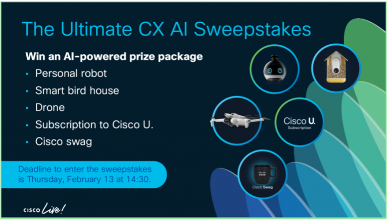 If you attend the event in Amsterdam, you can participate in The Ultimate CX AI Sweepstakes while you explore everything Cisco Customer Experience has planned for you. You'll have a chance to win an incredible AI-inspired prize package featuring an AI-assisted personal robot, an AI-assisted drone, an AI-powered birdhouse, Cisco swag, and a subscription to Cisco U. (all worth a total value of more than 2700 Euro).