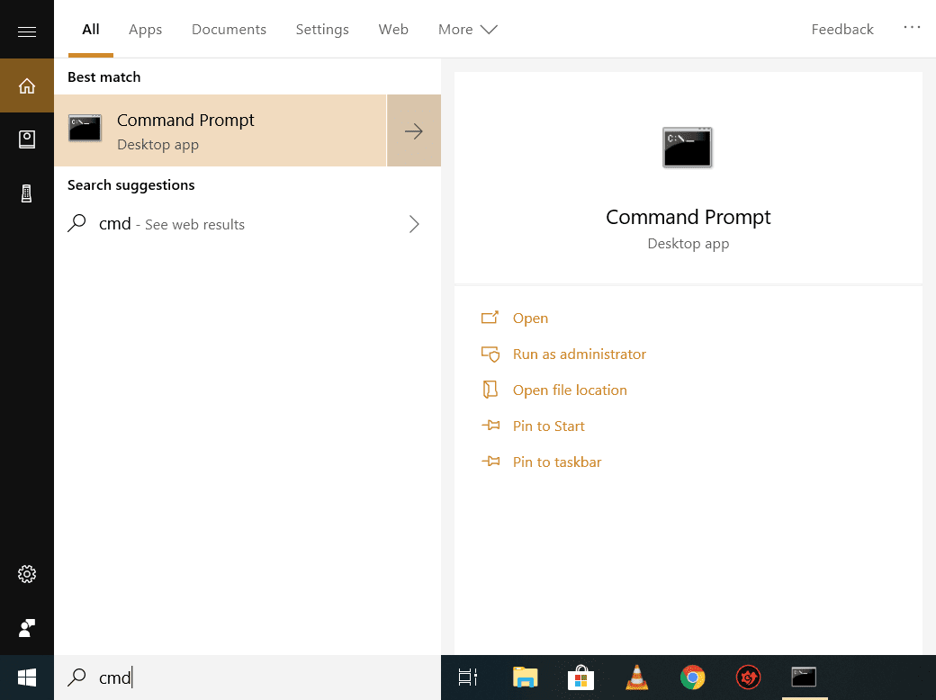 Or, go to the Windows Search bar, enter cmd, then choose Command Prompt.