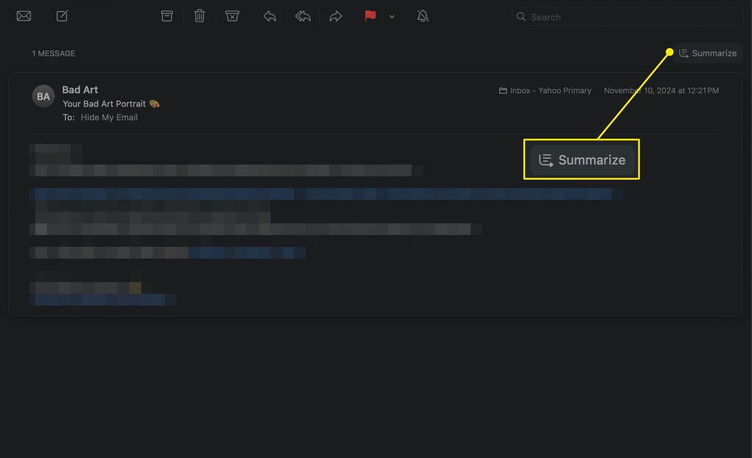 For an Apple Intelligence email summary, open an email in the Mail app and select Summarize at the very top. The most important information from the message or thread will appear above the email.