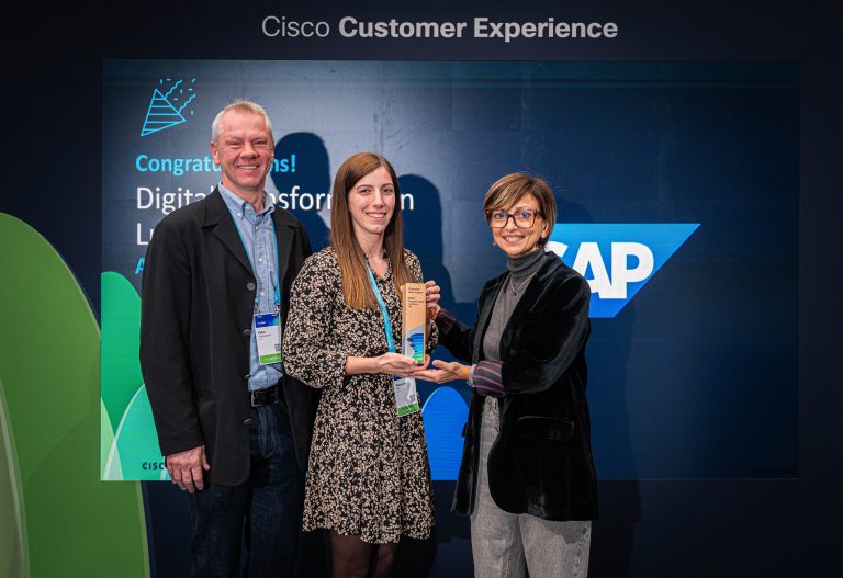 Peter Panzenboeck and Natascha Nick accept the award for Digital Transformation Luminary from Adele Trombetta, SVP & GM, CX EMEA, Cisco.