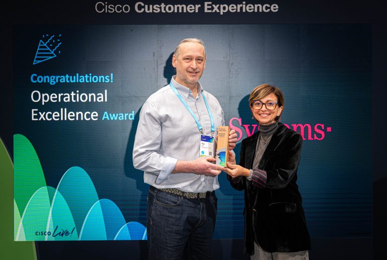 Paul Starr accepts the award for Operational Excellence from Adele Trombetta, SVP & GM, CX EMEA, Cisco.