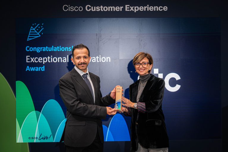 Saad Alqahtani accepts the award for Exceptional Innovation from Adele Trombetta, SVP & GM, CX EMEA, Cisco.
