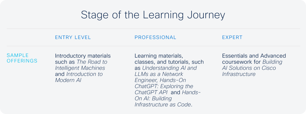 For those just considering a career in IT, Cisco provides a suite of resources to help them become well-versed in AI at earlier stages in their learning journey.