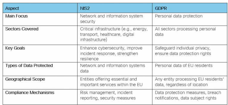 NIS2 and GDPR collectively establish a robust framework for data protection, see Figure 2: Comparative Overview of NIS2 and GDPR. Each targets distinct aspects of security and privacy. Incorporating Cisco's advanced security solutions helps organizations comply to the broader regulatory landscape.