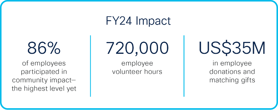 At Cisco, serving our local communities is a core part of the employee experience. In fiscal 2024, for the fifth year in a row, more than 80% of employees participated in community impact by giving their time, money, talent, and skills, as well as by advocating for causes, taking pledges to act, and participating in sustainability efforts. In addition to making a difference in the world, research shows that employees, leaders, and teams who give back to their communities are linked to lower attrition, higher recognition, and higher rewards.