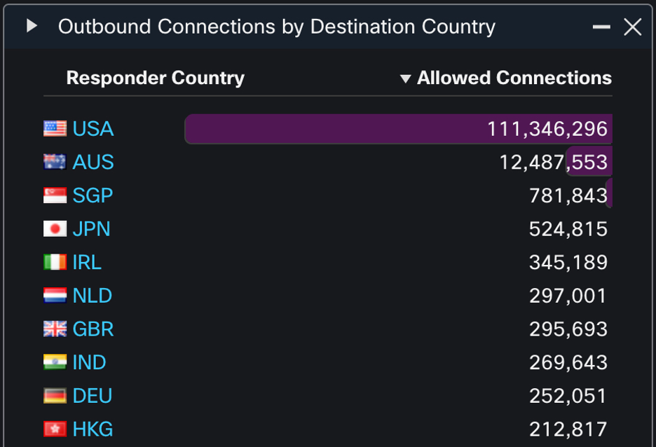 From a geolocation perspective, Cisco Live attendees showed a strong prevalence for connections back to the USA, dwarfing all other connection destinations.