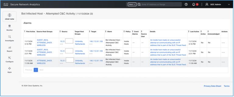 Cisco Secure Network Analytics (formerly known as Stealthwatch Enterprise) provides full visibility across the Conference network and uses advanced analytics to detect and respond to threats in real-time. These threats include command-and-control (C&C) attacks, distributed denial-of-service (DDoS) attacks, unknown malware, and insider threats.