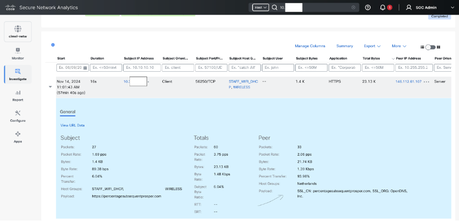 Secure Network Analytics validated the traffic patterns with Fake Application Detected events. This was then escalated to the NOC team as the Infra Management segment was under their ownership.
