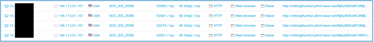 Armed with this information, there are two strategies for correlating the Umbrella DNS events with Firewall events. By filtering the Firewall connections for the destination IP address associated with Umbrella Malware blocks (146.112.61[.]107) we can find any connections the client subsequently made after resolving the malicious domain. If the connection is attempted over HTTP or HTTPS, we can very likely see the hostname in the HOST header or Server Name Indication (SNI) extension field. This is because the client still thinks it is connecting to the intended malware server, and not Umbrella.