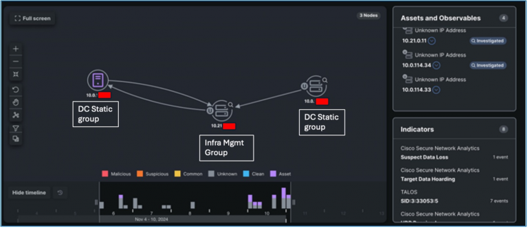 We investigated the source and destination entities in XDR Investigate and it found another neighboring device from the Infra Management host group also involved in similar traffic patterns. Additionally, the traffic between the devices in Infra Management and DC Static host groups triggered a bunch of Snort signatures on the firewall.