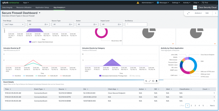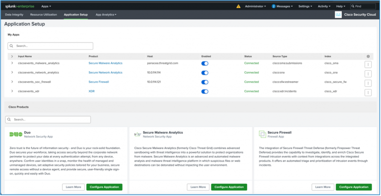 The Cisco Security Cloud app, which is published on the Splunk base app store, is a single app to get data from Cisco Security tools into Splunk. The app is modular so individual products can be configured to ingest data into Splunk including Secure Malware Analytics, Firewall, Secure Network Analytics, Cisco XDR and more. The app includes a pre-configured dashboard for each product and health monitoring of the app to see how much data is being ingested. When data is ingested, the app transforms the data to a Common Information Model (CIM) which is Splunk's universal schema for indexing data. This allows us to create visualizations across multiple data sets or search for a single field across multiple telemetry types.