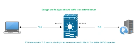 Cisco Secure Firewall's decrypt and re-sign feature functions as a Man-in-the-Middle, allowing it to intercept and inspect encrypted traffic. It securely connects with both the user and destination server by intercepting each side of the SSL communication. The user is presented with a CA certificate from the Firewall, which they must trust to complete the connection. This setup enables the Firewall to decrypt, inspect, and re-encrypt traffic for security analysis.