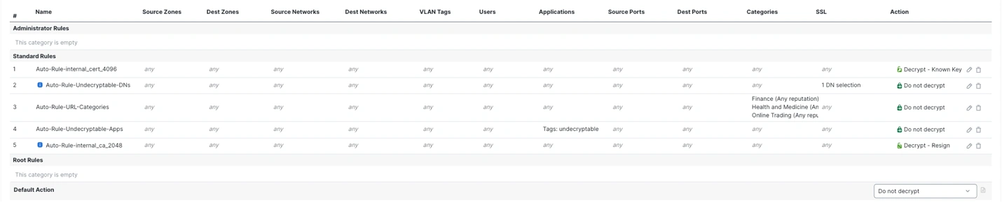 | Decrypt -Resign | Decrypts and inspects outbound SSL/TLS traffic, then re-encrypts it with the firewall's certificate. | Used for inspecting outbound traffic to detect threats. |