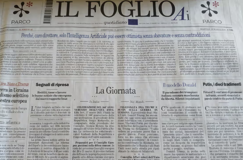 The Italian newspaper 'Il Foglio' has released an edition entirely generated by AI, marking (as far as we know) an unprecedented step in journalism. This four-page supplement, 'Il Foglio AI,' accompanies the regular print edition and is accessible online.