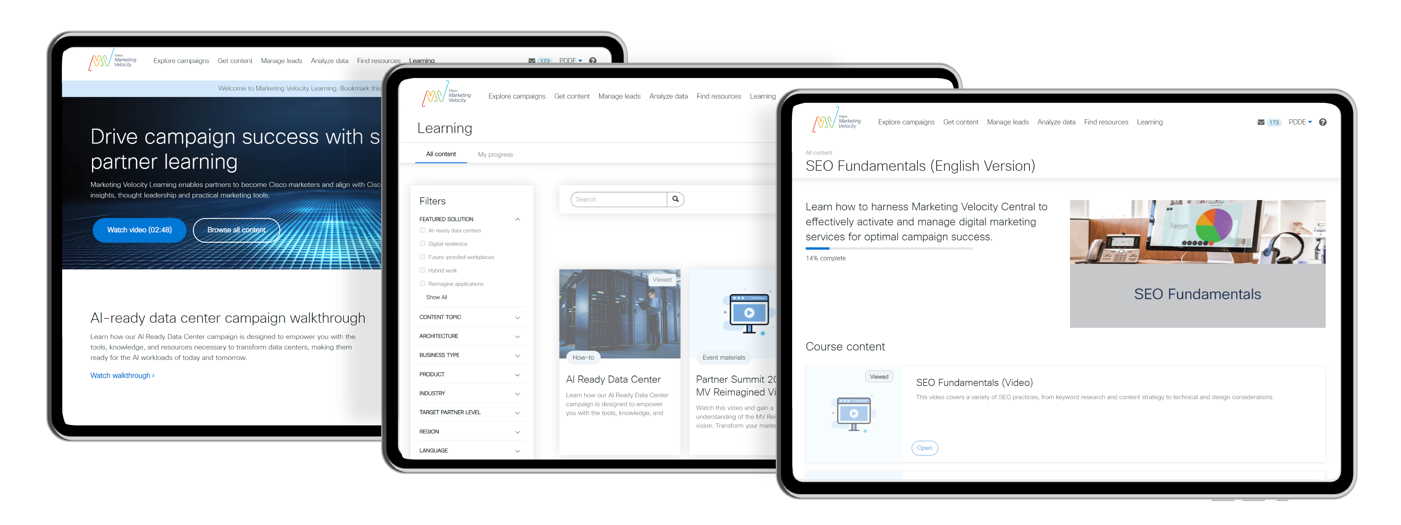 Whether you're familiar with Marketing Velocity Central, Marketing Velocity Learning, or both, we promise that by learning, aligning, and activating campaigns from the One Marketing Velocity, you'll unlock maximum benefits as a Cisco partner marketer.