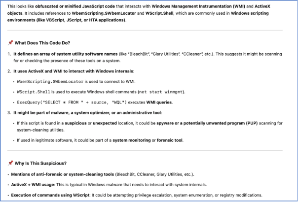 Using public generative AI tools, the analysis of the payload yielded the following results, revealing consistent patterns of malicious activity - including attempts to identify anti-malware tools (likely for removal to maintain persistence) and potentially escalate privileges further.