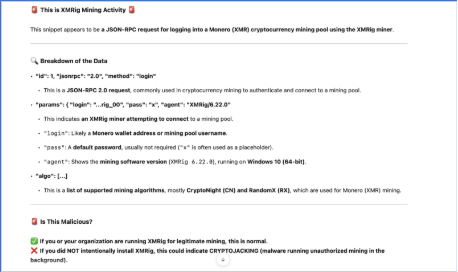 Using public generative AI tools to decode plain text, we identified mining software (XMRig) making RPC calls to the Monero cryptocurrency network. Now, it's worth highlighting that, although suspicious, this could still be a legitimate case of an endpoint running mining software.