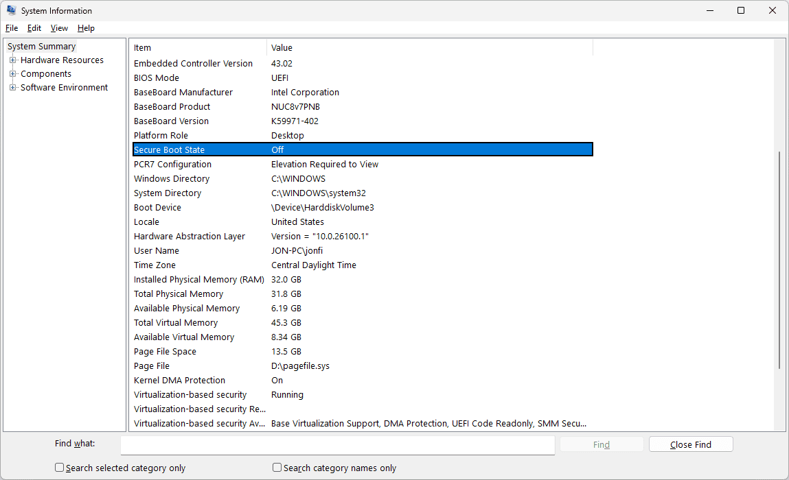 From the System Summary tab, look for Secure Boot State on the right side. If it says Off, then Secure Boot is disabled.