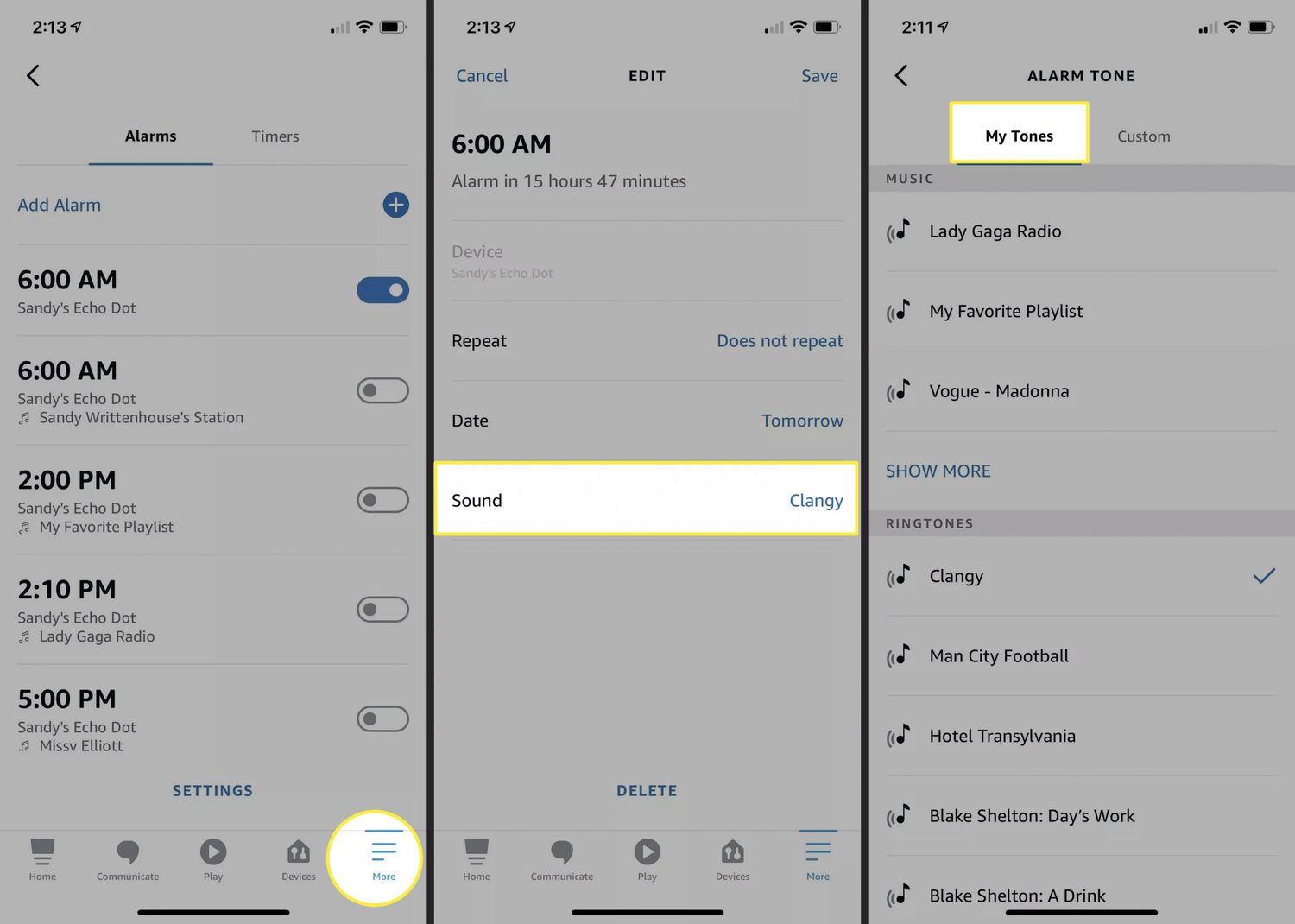Open the Alexa app, tap More, and select Alarms & Timers as you normally would.