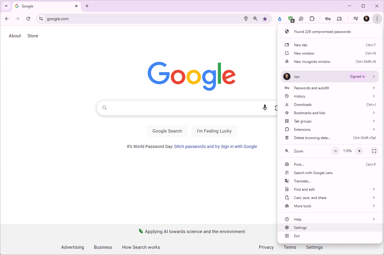 Select the three dots in the corner of the browser to open the menu, and then choose Settings.