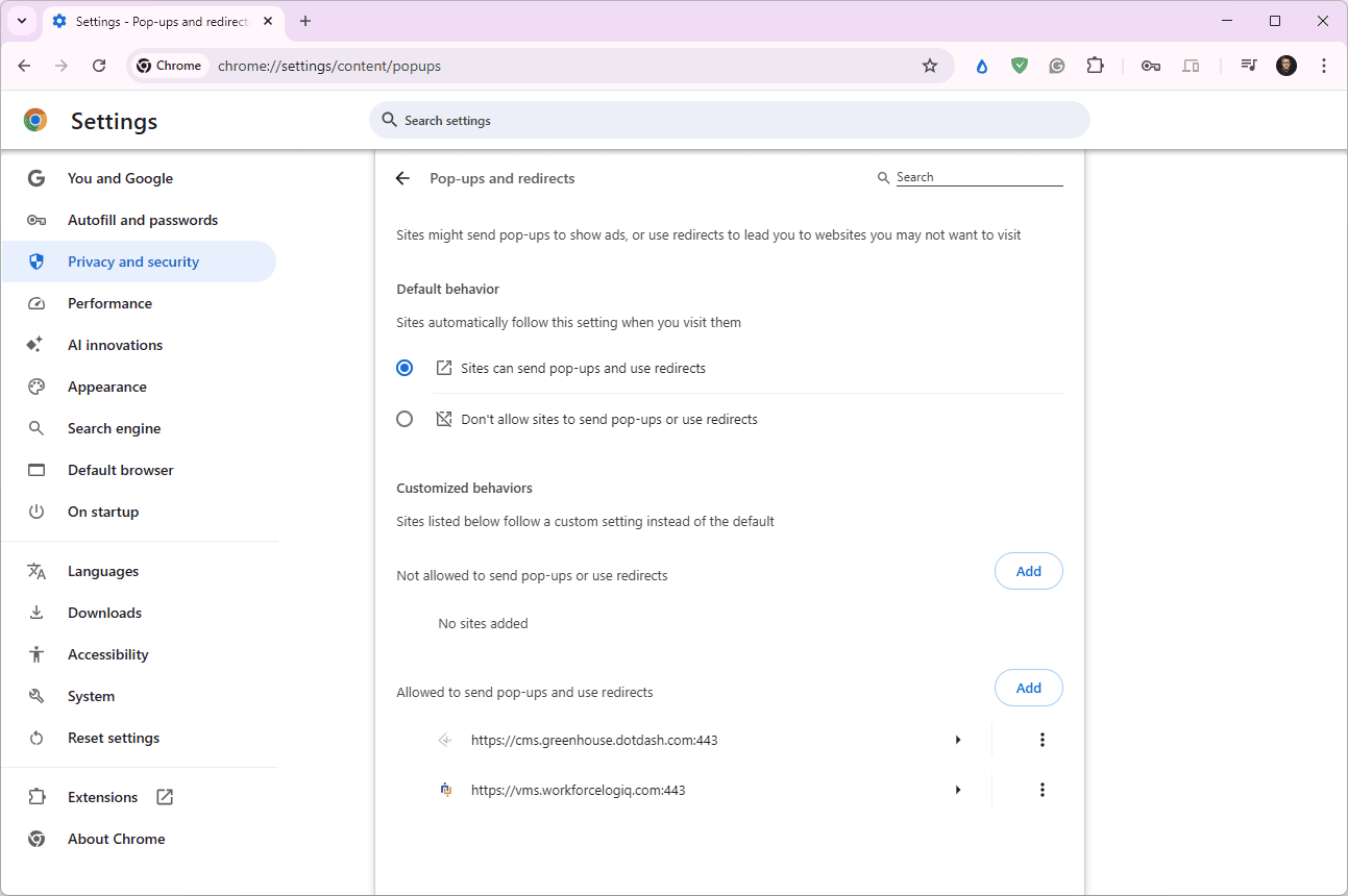 To allow pop-ups from a certain site, select the Add button next to Allowed to send pop-ups and use redirects.