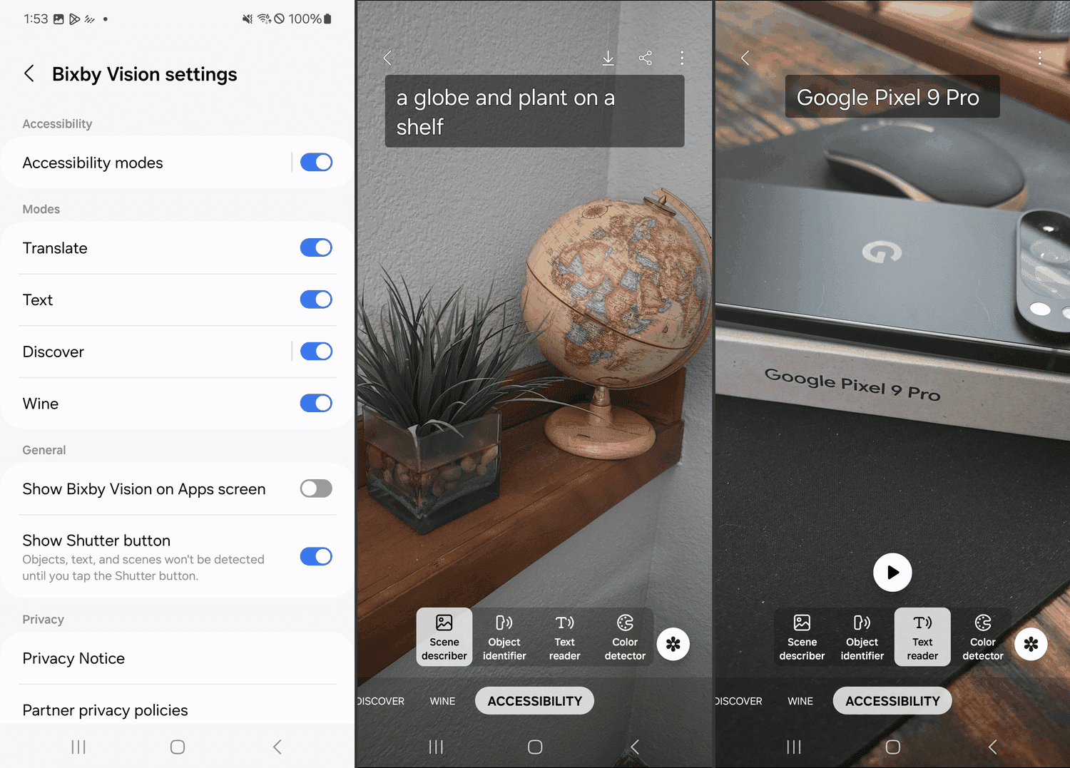 If you open the settings for Bixby Vision, you can turn on Accessibility modes. This lets you use four tools that further expand this feature's usefulness: Scene describer, Object identifier, Text reader, and Color detector.